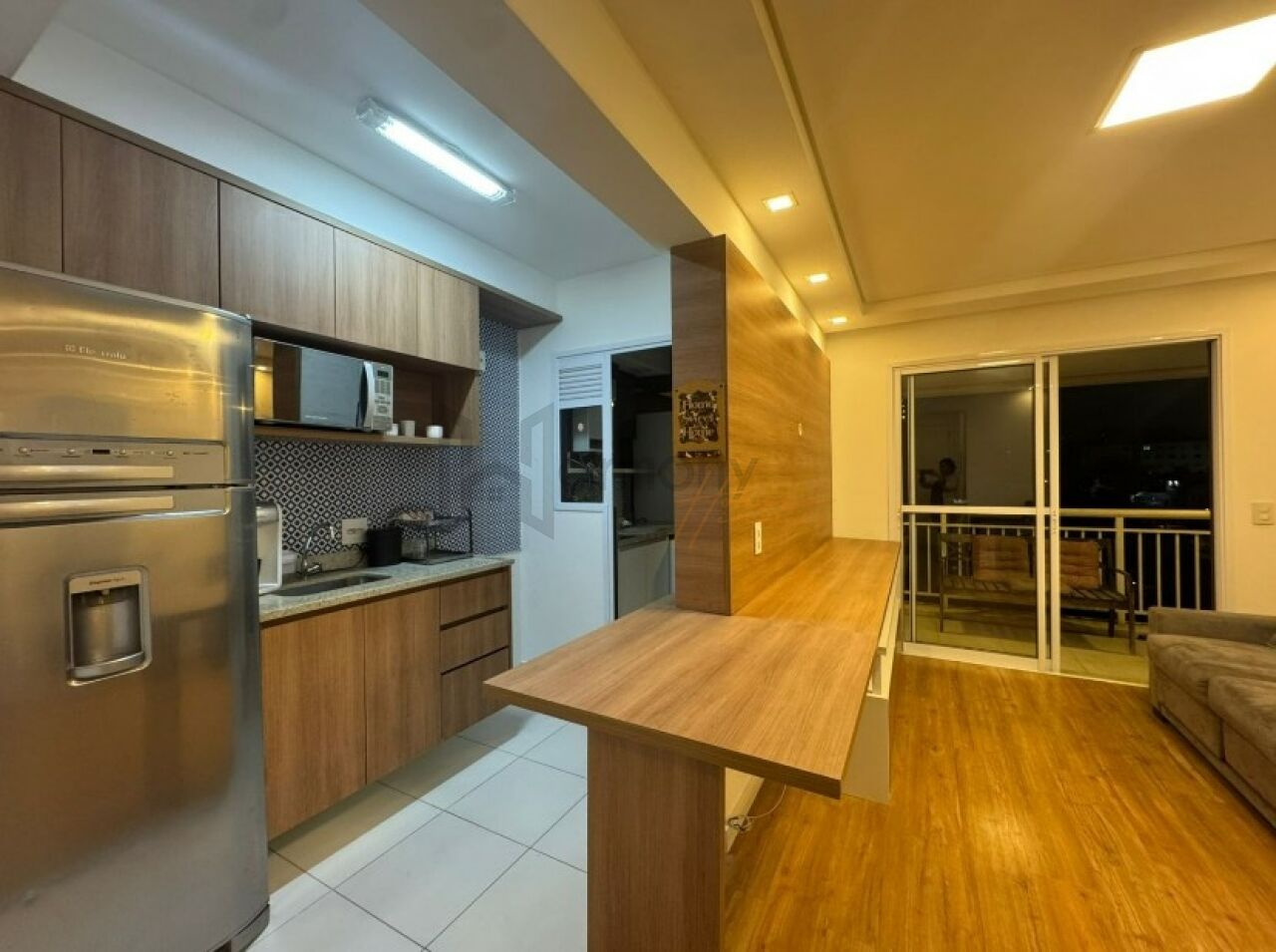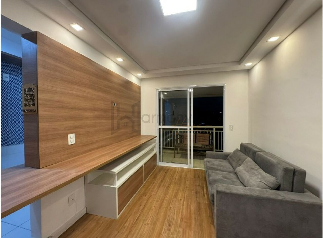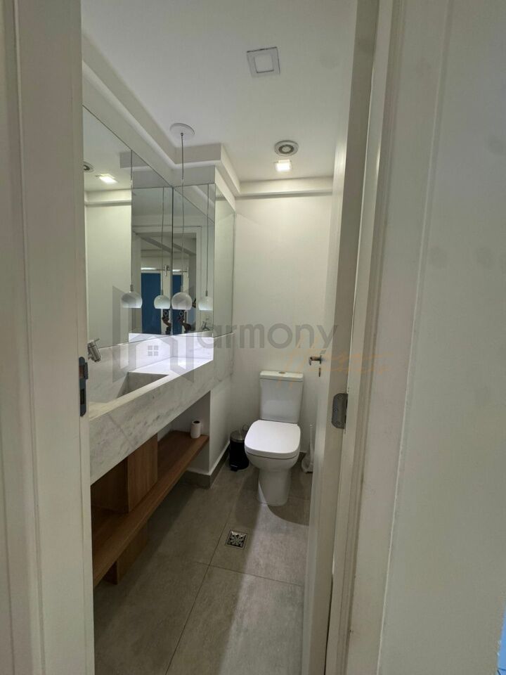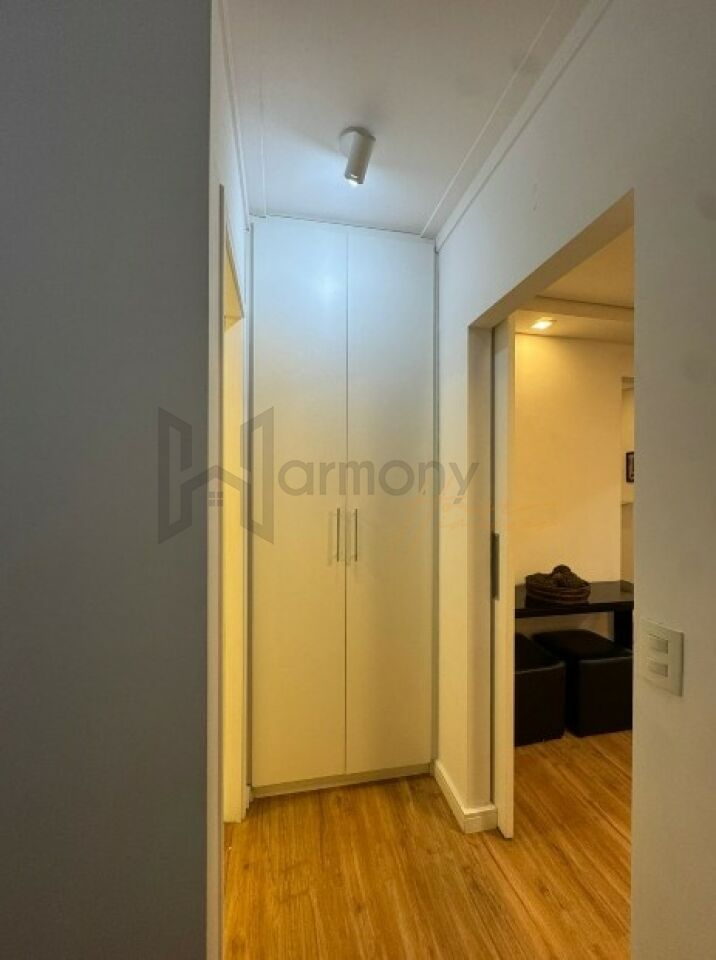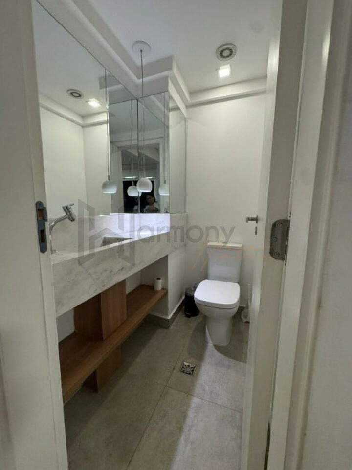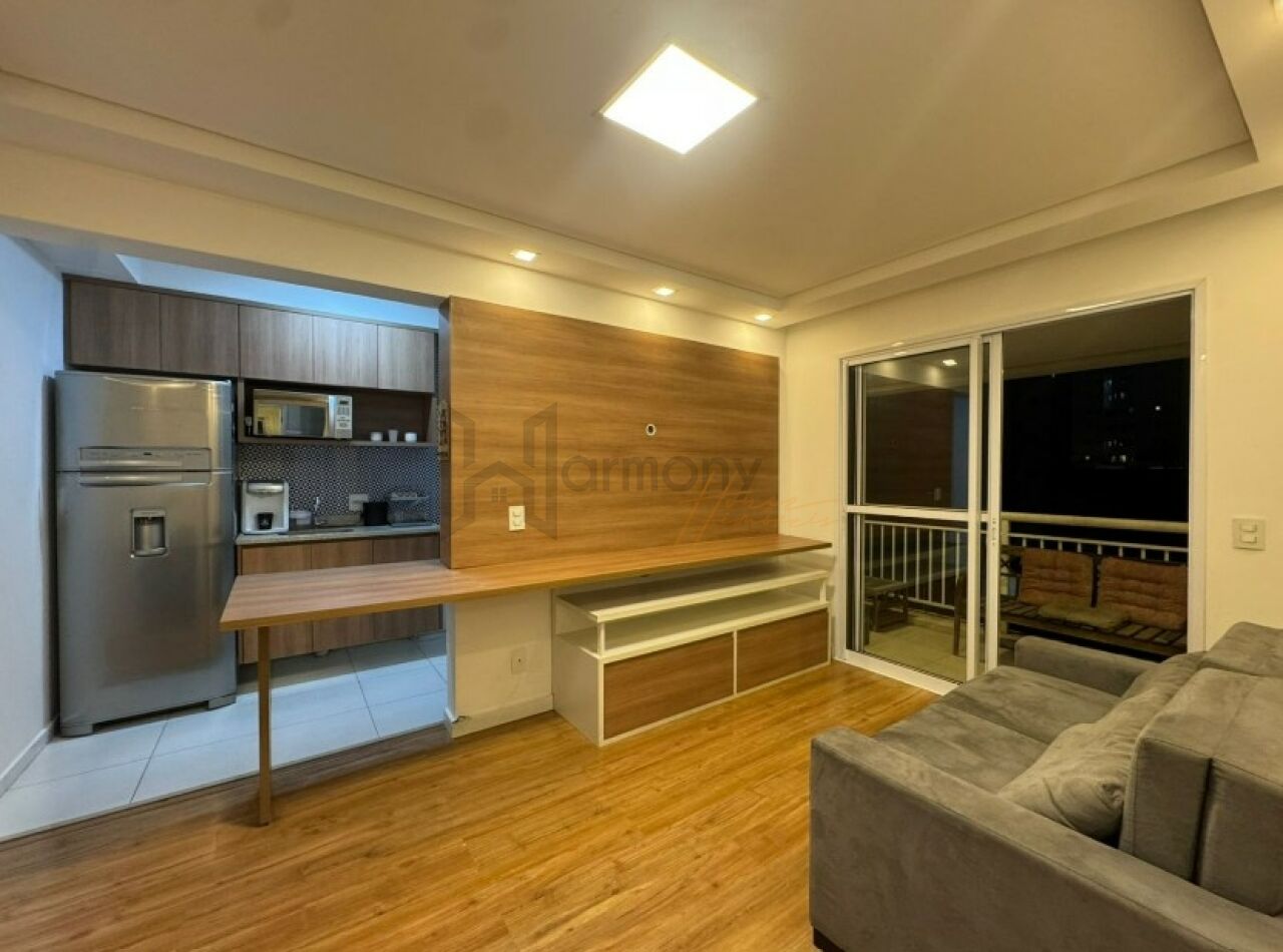 Planta privilegiada com 53m2, 1 suíte, cozinha americana integrada com a sala, área de serviço e varanda. Banheiro completo com ventilação natural. Lavabo completo. Apartamento equipado com armários planejados, geladeira, Piso laminado, lavanderia com lava e seca, sacada com poltronas, sala com sofá e rack e aparador.