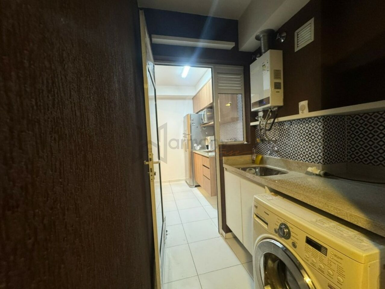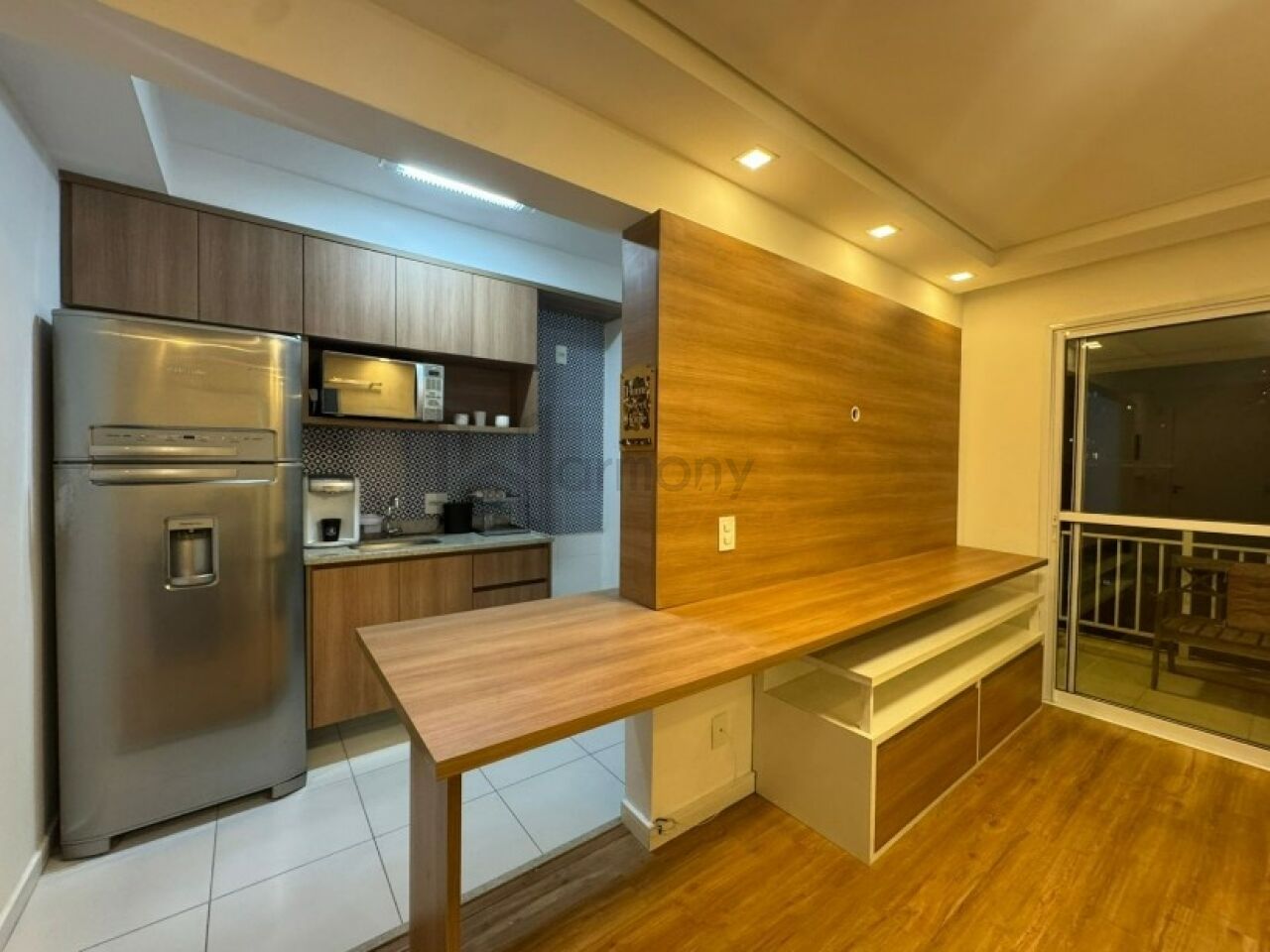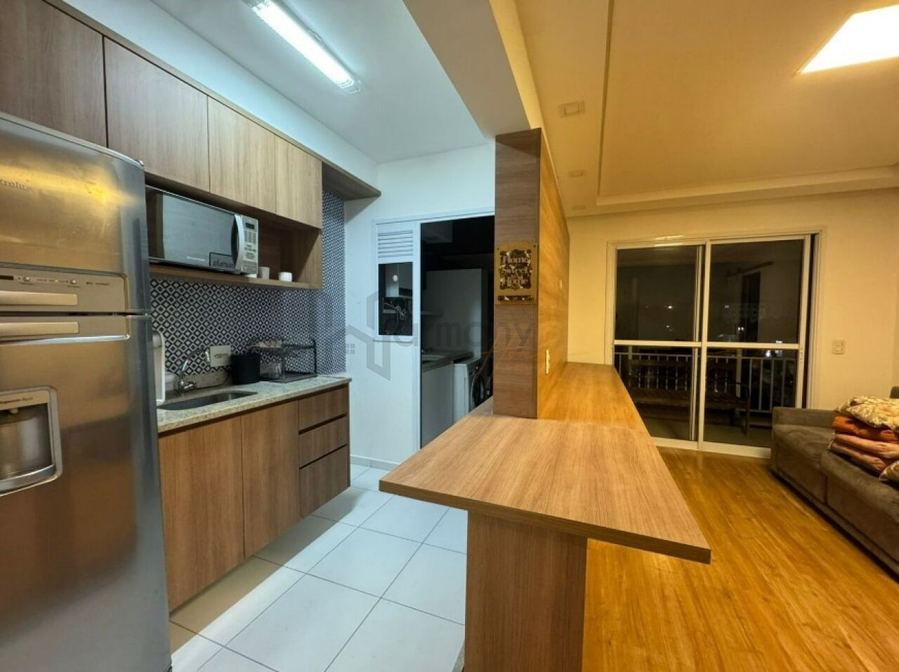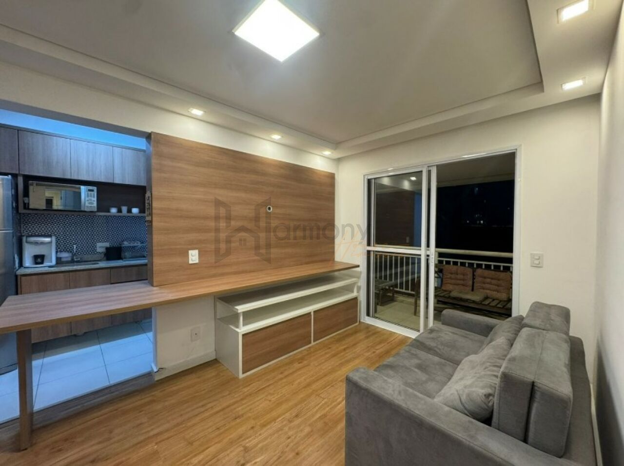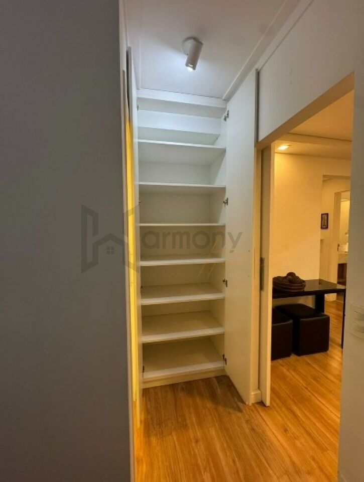 Planta privilegiada com 53m2, 1 suíte, cozinha americana integrada com a sala, área de serviço e varanda. Banheiro completo com ventilação natural. Lavabo completo. Apartamento equipado com armários planejados, geladeira, Piso laminado, lavanderia com lava e seca, sacada com poltronas, sala com sofá e rack e aparador.
